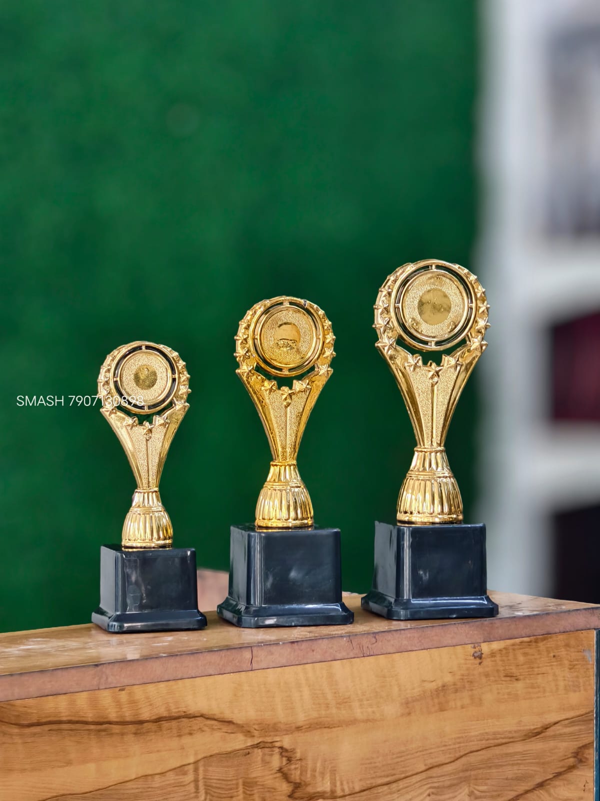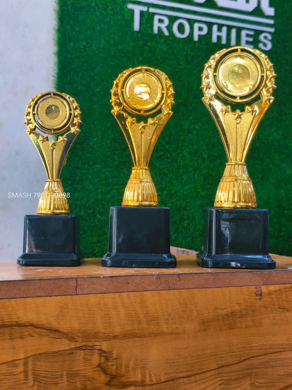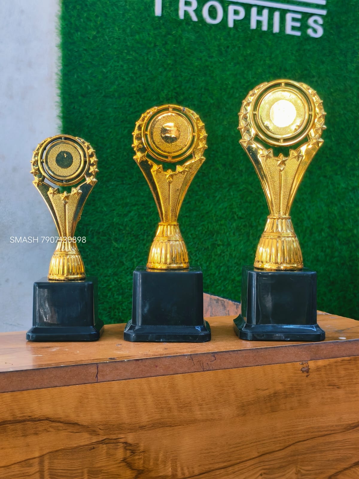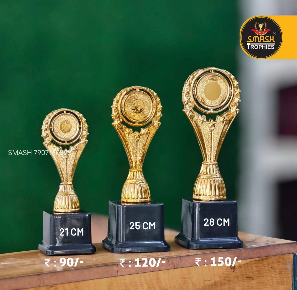 This plastic trophy set includes three sizes: 28 cm for the winner, 25 cm for the runner-up, and 21 cm for third place, all offered together at a combo price of 320.