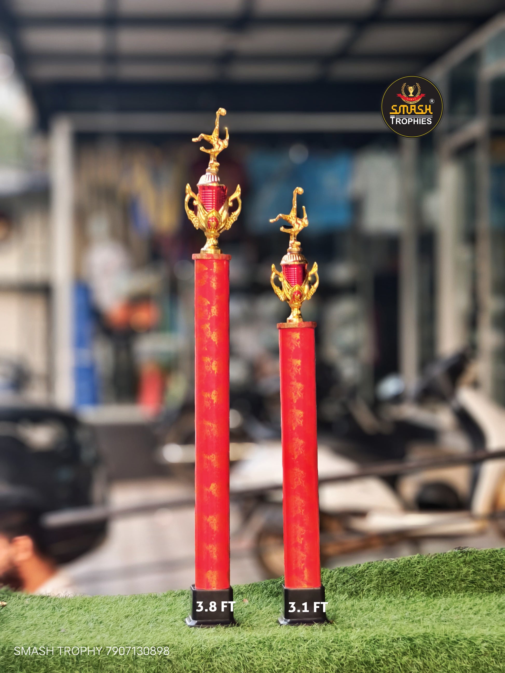 This trophy features a winner size of 3.8 feet and a runner-up size of 3.1 feet. It is crafted from plastic with a wooden base, combining durability with a classic look.