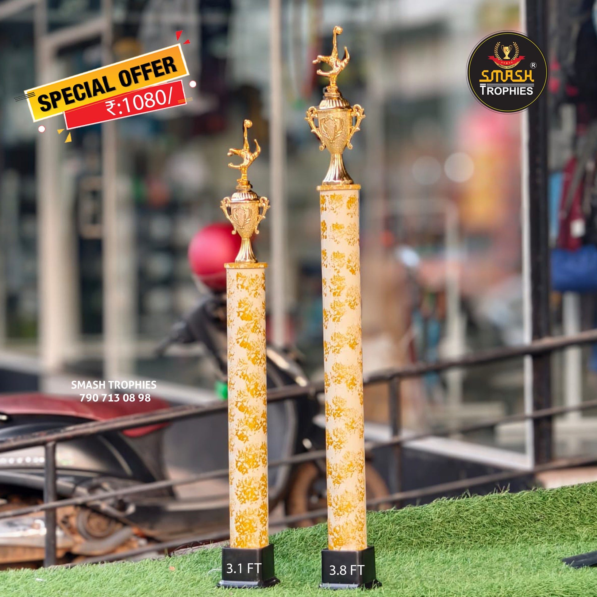 This plastic trophy features a winner height of 3.8 feet and a runner-up height of 3.1 feet. It is a compact and modestly sized award.