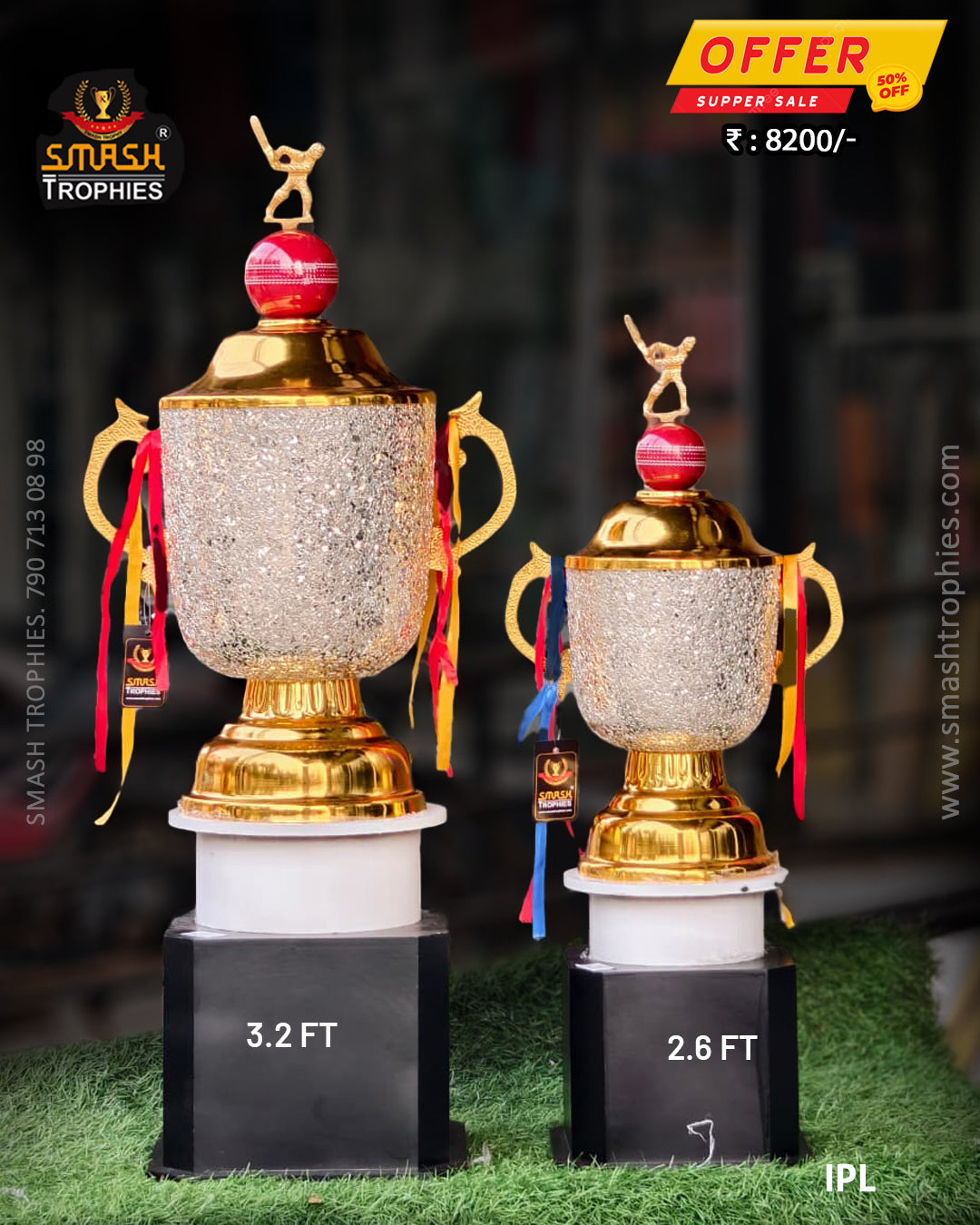 IPL Cricket Trophy Winner - Celebrate championship victories with this striking 3.2 ft tall trophy, perfect for recognizing top performers. The sleek metal construction pairs beautifully with a sturdy wooden base, creating an elegant display piece for any cricket enthusiast. Also available in a 2.6 ft runner-up version. Ideal for tournaments, corporate events, and sporting achievements. Premium quality craftsmanship at an exceptional price point.