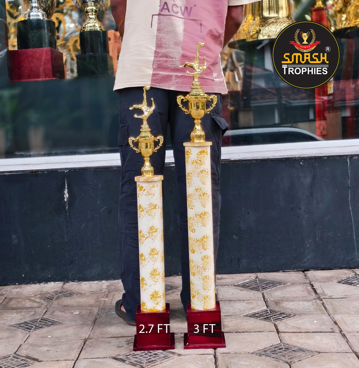 Plastic trophies 108-980 MS available at an offer price of 980 INR, originally priced at 1580 INR. Winner trophy measures 3 feet, and runner-up trophy measures 2.7 feet.