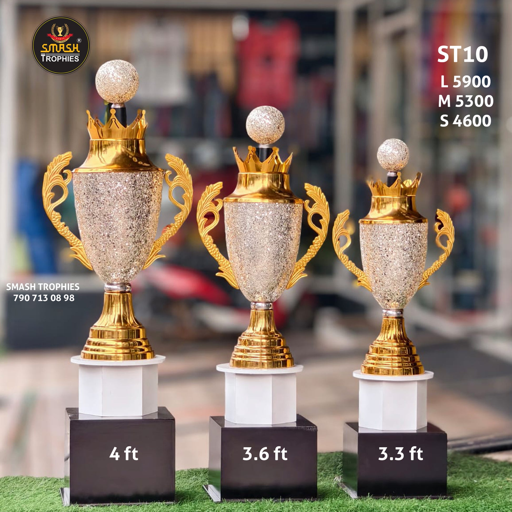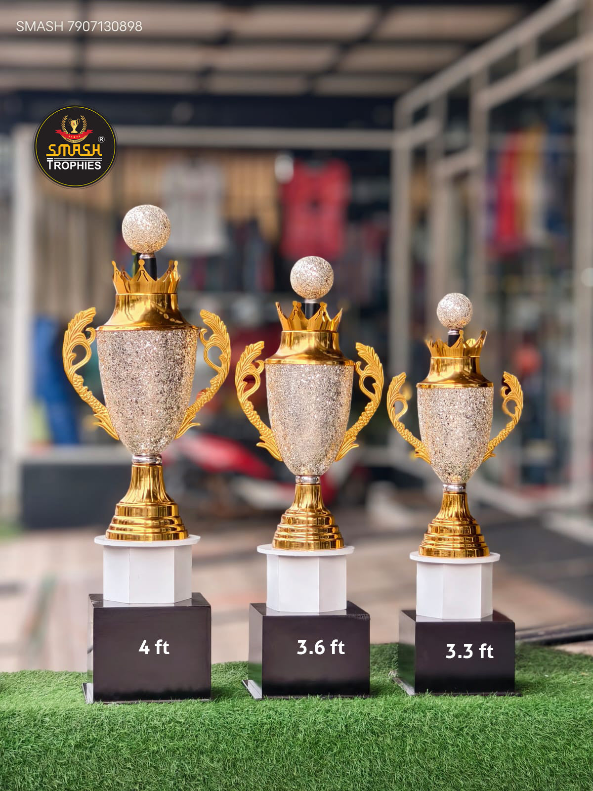 Champion 4 feet, First Runner-up 3.6 feet, Second Runner-up 3.3 feet. Premium tiered trophy sizing that clearly distinguishes achievement levels across your competition rankings.