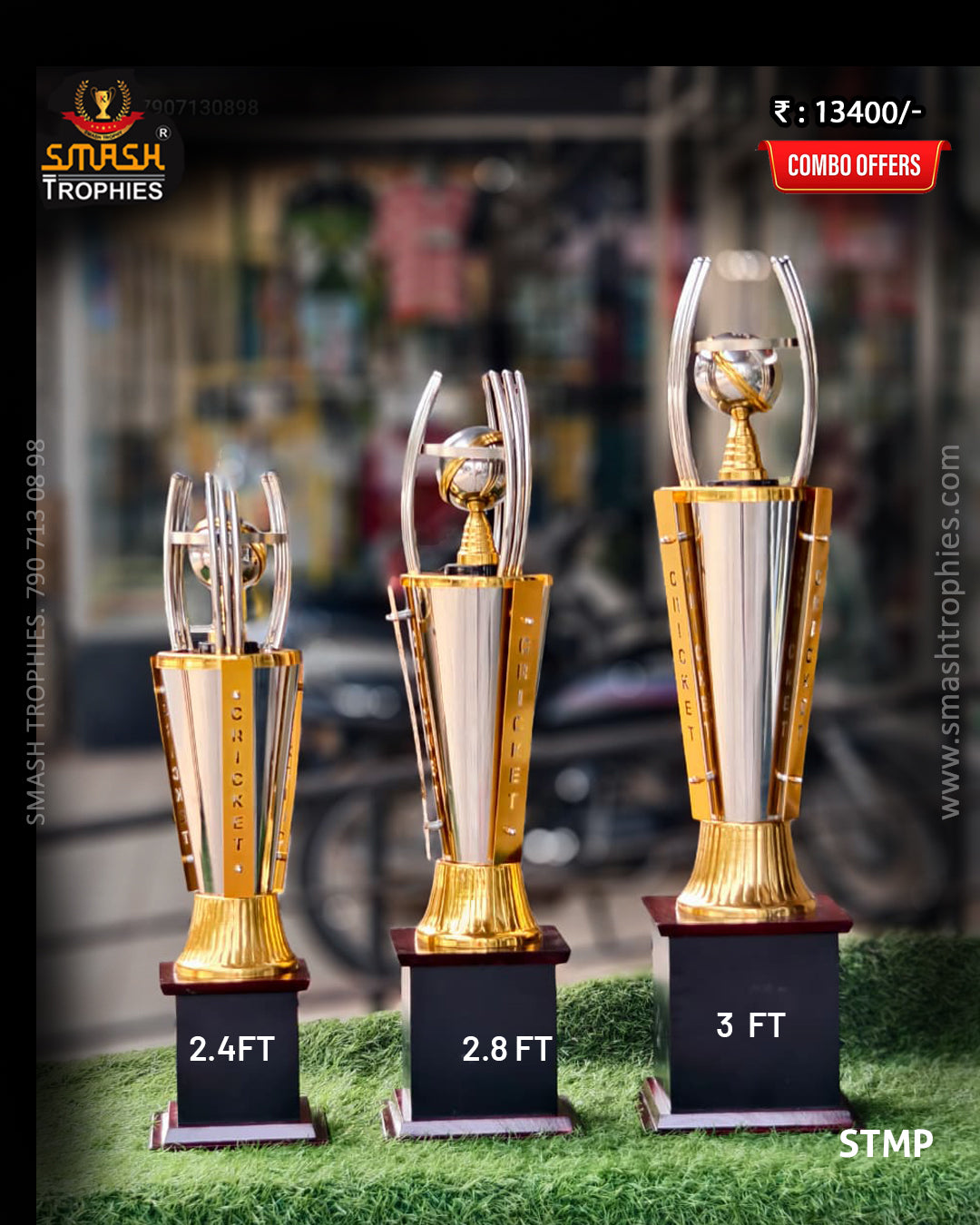 Elevate your sports events with this premium tiered trophy set. Featuring three distinct heights—3 ft for champions, 2.8 ft for runners-up, and 2.4 ft for third place—this collection celebrates every achievement. Crafted with gleaming metal construction and a sturdy wooden base, these trophies deliver lasting elegance. Perfect for football, cricket, volleyball, and other competitive sports tournaments. Ideal for schools, clubs, and corporate events seeking quality recognition pieces. Now available at an exceptional offer price of ₹13,400.